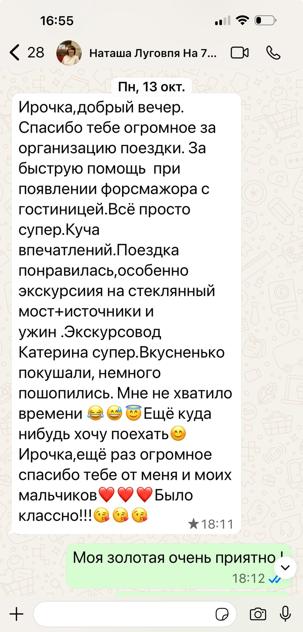 В нашу компанию обратилась семья из пяти человек (двое взрослых, трое детей, один из деток в возврасте 2,5 лет) для оформления тура в ЖаоХэ.Путевку подобрали, рассказали где и когда будет посадка.Подсказали где можно выгодно поменять ¥. Руководитель Валентина провела интересную эксскурсию по местам выгодного шопинга и вкуснейшей Китайской кухни. Сопровождение проходило от момента заключения договора до возвращения семьи из их маленького путешествия. Развлениния пришлись всем членам семьи по душе, даже самый маленький турист был в восторге. Со слов наших туристов тур очень понравился: цитирую " Теперь в Китай только с Вами, огромное спасибо таким отзывчивым и замечательным руководителям".